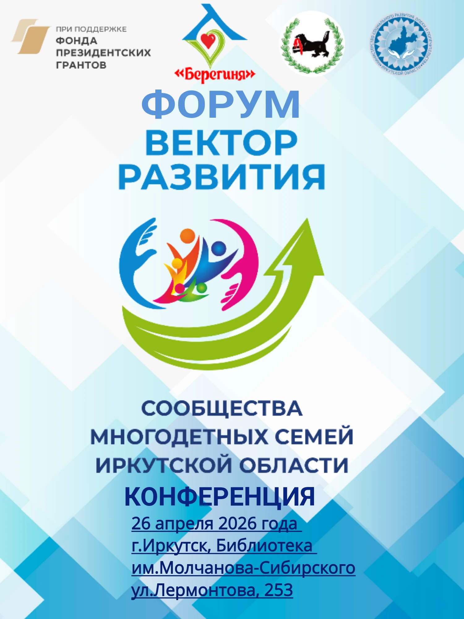 26 апреля 2026 года пройдет Форум "Вектор развития" для многодетных семей, реализуемый Ассоциацией "Берегиня" при поддержке Фонда президентских грантов.