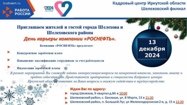 13 декабря Кадровый центр Иркутской области приглашает на день карьеры компании "Роснефть"